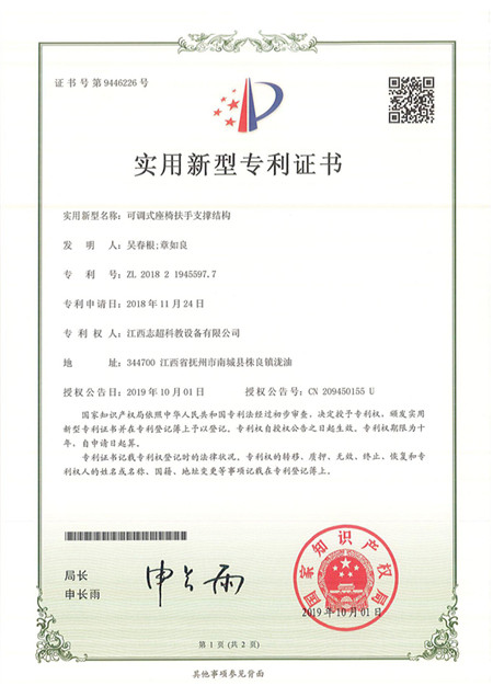 可調(diào)式座椅扶手支撐結(jié)構(gòu)實(shí)用新型專利證書江西志超科教設(shè)備有限公司